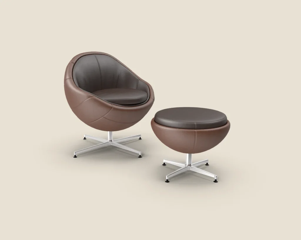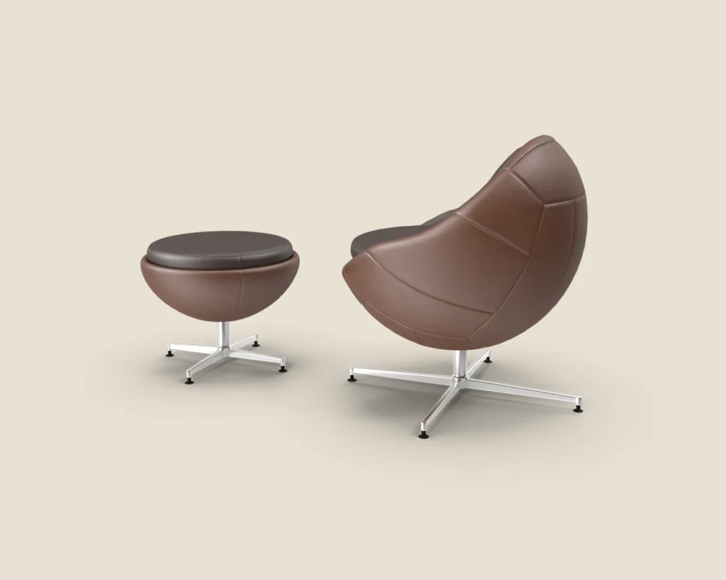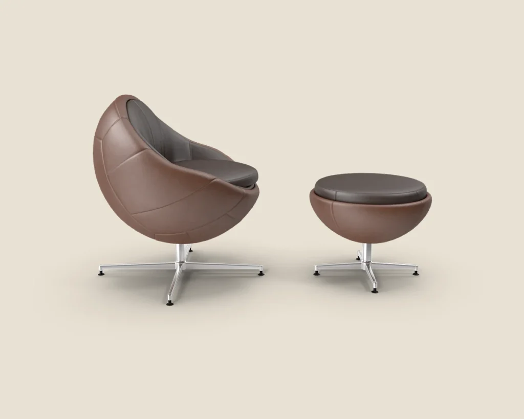 The Orbit Recliner combines futuristic design and comfort with premium leather upholstery, a sleek metal base, and a matching ottoman, perfect for modern living spaces.