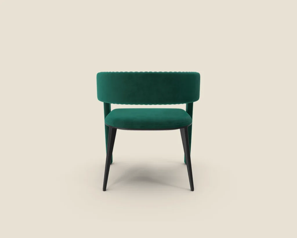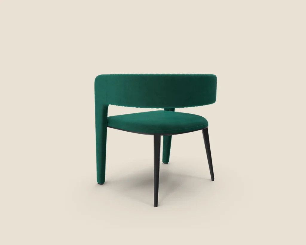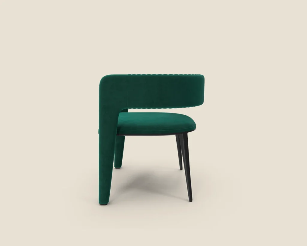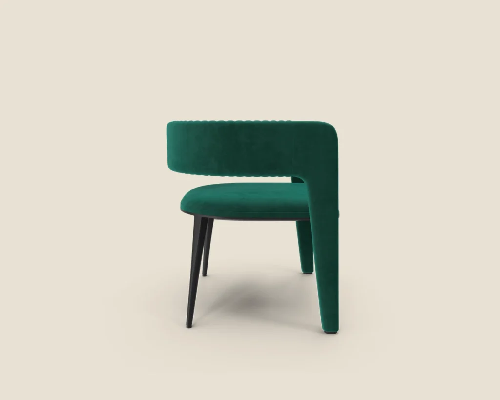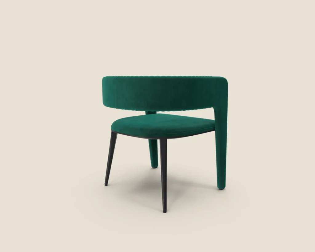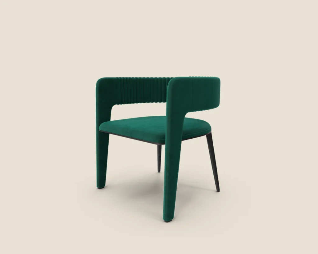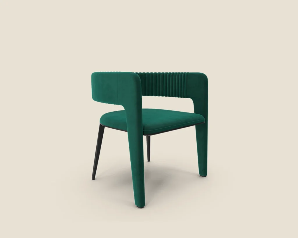 The Velvet Curve chair features a luxurious velvet finish, ribbed detailing, and a sleek modern design, making it perfect for adding a stylish touch to any room.
