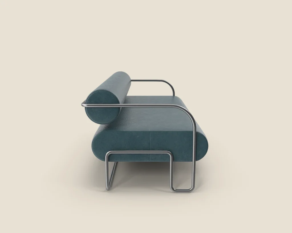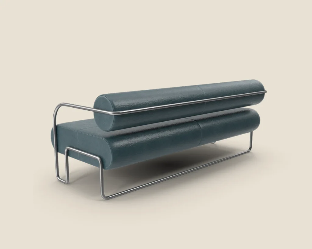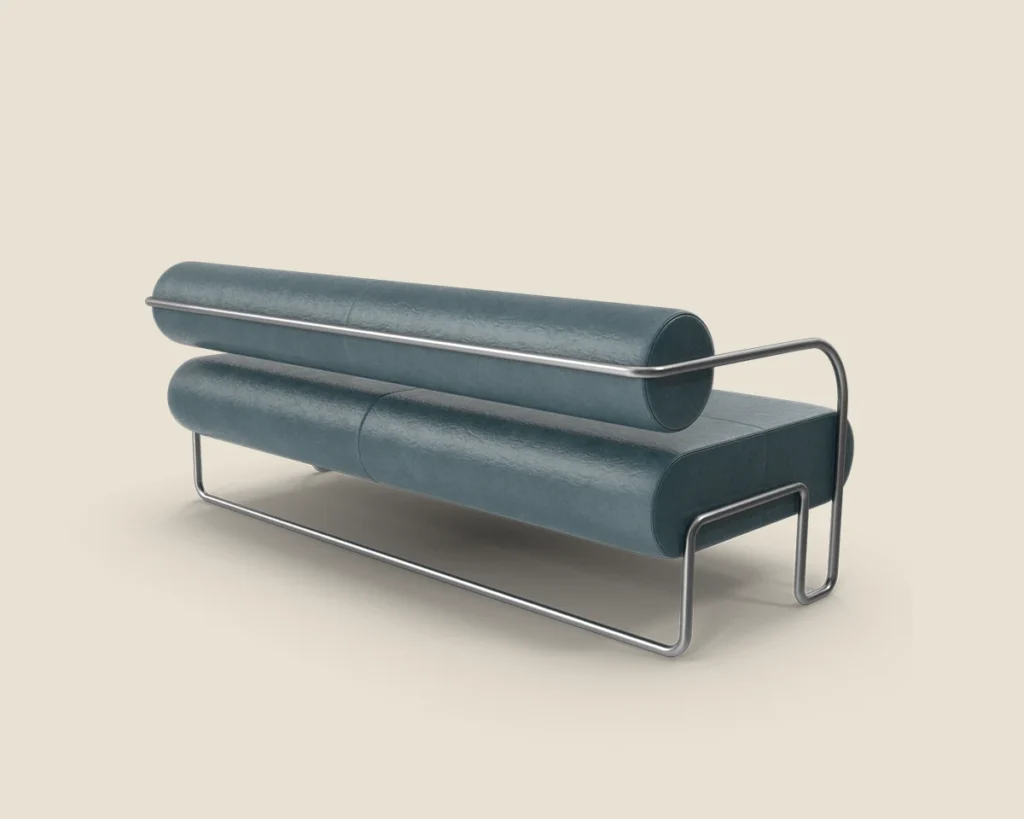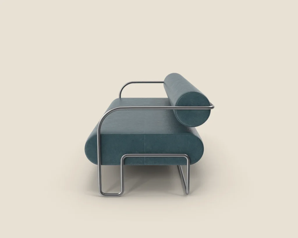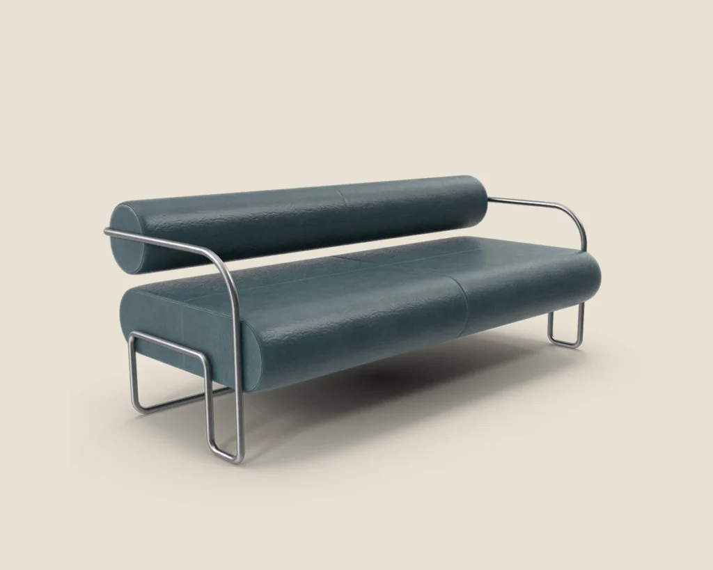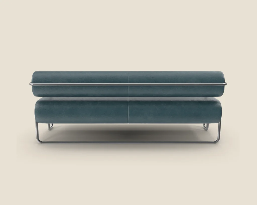 A contemporary sofa featuring a sleek metal frame and plush cushions, offering both style and comfort for modern spaces.